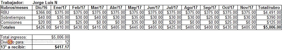 El decimotercer sueldo es la suma de todos los ingresos por concepto de remuneración básica, sobretiempos, comisiones y/o bonificaciones que un empleado haya recibido entre el 1 de diciembre del año anterior y el 30 de noviembre del año en curso, cuyo valor total se dividirá para doce y esa cantidad resultante es la que el trabajador deberá recibir en este mes.